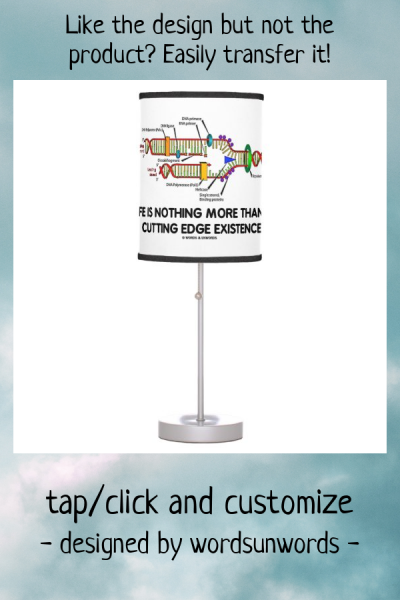 Wry molecular biology humor is found on this lamp featuring DNA replication along with the following existential scientific saying: "Life Is Nothing More Than A Cutting Edge Existence". No need to be a biologist or geneticist to enjoy tongue-in-cheek geek humor the next time you turn on the light with this lamp! myMolecularBiology
