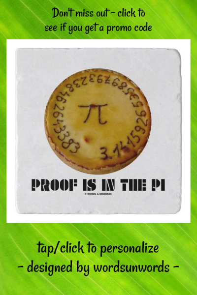 Wry pi fan humor is alive and well on this trivet featuring pi the mathematical constant and irrational number on a baked pie along with the following saying that will make others scratch their heads and wonder what you are referring to: "Proof Is In The Pi". myMathematician