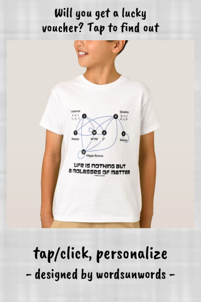 Showcase your wry particle physics sense of humor with any of these gifts featuring the Standard Model of the Higgs field completely with quarks leptons photons and the Higgs boson along with the following truism saying from a quantum perspective: "Life Is Nothing But A Molasses Of Matter". myPhysics