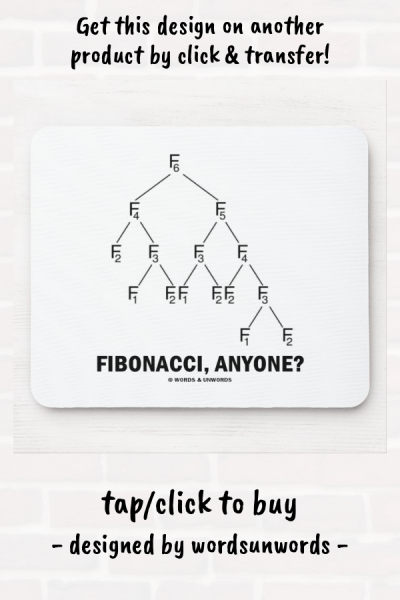 Showcase your wry mathematical side with this Fibonacci lattice mousepad with the caption "Fibonacci Anyone?". Fibonacci sequences appear in biological settings in two consecutive Fibonacci numbers such as branching in trees or the arrangement of leaves on a stem. Make others do a double-take on the combinatorial interpretation of Fibonacci numbers with this tree graph mousepad. myMathematician