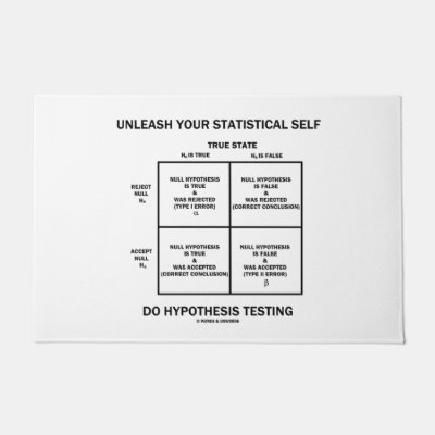 Statisticians will enjoy this stats humor doormat featuring statistical error summarized in a chart including Type I and Type II errors along with the geek humor saying: "Unleash Your Statistical Self Do Hypothesis Testing". Memorable statistics attitude door mat for any statistician or anyone who engages in hypothesis testing! myStatistician