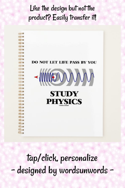 Showcase your wry twisted physics attitude with this planner featuring the Doppler Effect along with the double-entendre saying that will make others do a double-take on the subject of physics: "Do Not Let Life Pass By You Study Physics". Note: There is no error in the saying "Do Not Let Life Pass By You" as opposed to the common saying of "do not let life pass you by". You'll need to seize the moment with a dose of physics humor with this planner which promotes the study of physics! No need to be a physics major or physics teacher to enjoy. myPhysics