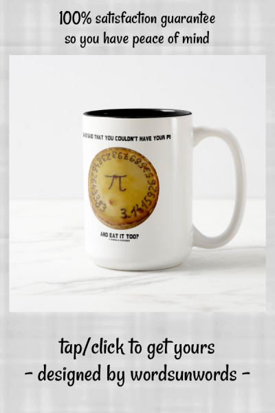 Showcase your wry mathematical constant pi fan side with this mug featuring the irrational number pi on a baked pie along with the following rhetorical question: "Who Said That You Couldn't Have Your Pi And Eat It Too?" Geek pi humor mug for anyone who is hungry for pi! myMathematician