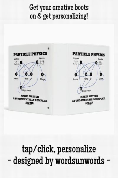 Showcase your wry physics attitude with this binder featuring the Standard Model of the Higgs field including quarks leptons and photons along with the truism saying "Particle Physics Makes Matter A Fundamentally Complex Affair". Make yourself and others do a double-take with a dose of particle physics geek humor with this binder! myPhysics