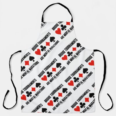 Bridge players who have played in many bridge tournaments will enjoy this all-over print apron featuring the four card suits along with the saying "Bridge Tournaments Are Mental Marathons". Make others do a double-take with a dose of bridge attitude at how truly taxing playing in a bridge tournament can be to the mind with this apron! myBridgePlayer