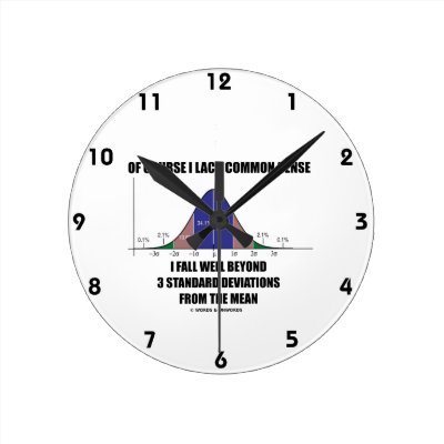 Do you lack common sense? If so you'll enjoy this clock featuring the bell curve distribution (also known as the normal distribution curve Gaussian curve) and the wry statistical attitude saying "Of Course I Lack Common Sense I Fall Well Beyond 3 Standard Deviations From The Mean". Make others do a double-take at your statistical side and guess exactly what you mean! myStatistician