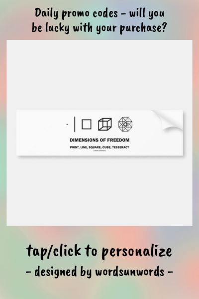 No need to be a mathematician or philosopher to enjoy wry geometric humor with this bumper sticker featuring five "Dimensions Of Freedom": point line square cube tesseract. Make others do a double-take with tongue-in-cheek mathematical humor on the different dimensions of freedom the next time you drive with this bumper sticker! myMathematician
