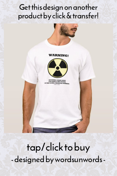 If you trade you'll enjoy this wry signage humor tee featuring the warning sign for radioactivity as well as the following tongue-in-cheek yet dead serious warning: "Warning! Decisions I Make Daily Can Cause A Meltdown In The Global Financial Markets". Make others do a double-take at the power you wield with this warning sign tee! myWarning