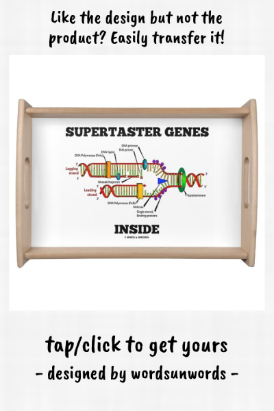 Are you a supertaster a person who experiences the sense of taste with far greater intensity than average? Scientists believe that there is a genetic component to being a supertaster namely that is related to the presence of the TAS2R38 gene. Showcase your wry molecular biology side if you are a supertaster with this serving tray featuring DNA replication along with the saying "Supertaster Genes Inside". myMolecularBiology