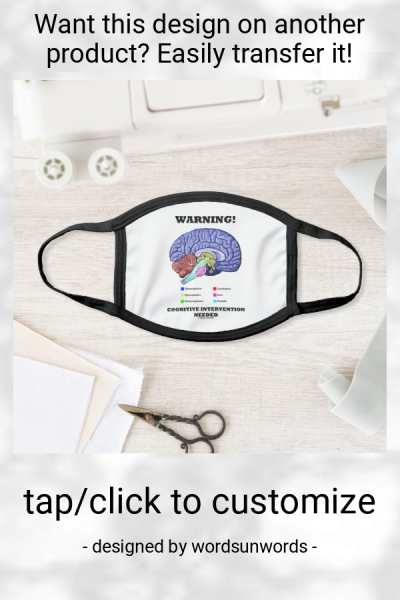 Showcase your wry brain anatomical sense of humor with this cotton/polyester face mask featuring the different parts of the human brain along with the following advice that will make others do a double-take on what you need: "Warning! Cognitive Intervention Needed". myWarning