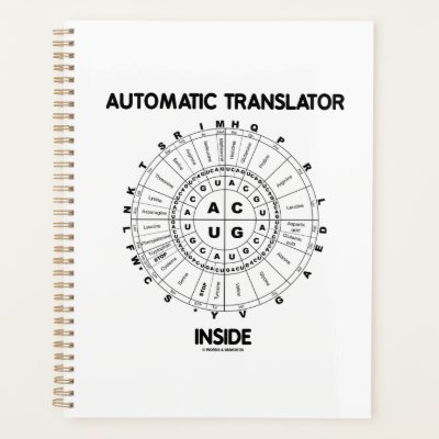 Showcase your wry RNA attitude with this planner featuring an RNA codon wheel along with the following scientific truism saying for anyone who knows about protein synthesis: "Automatic Translator Inside". Educational scientific geek humor planner for anyone who translates! myMolecularBiology
