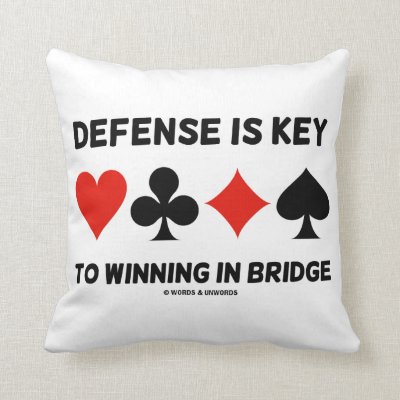 Showcase your wry defensive bridge player attitude with this throw pillow featuring the four card suits along with the following bridge truism saying: "Defense Is Key To Winning In Bridge". Memorable throw pillow for any bridge player who loves to defend a bridge hand! myBridgePlayer