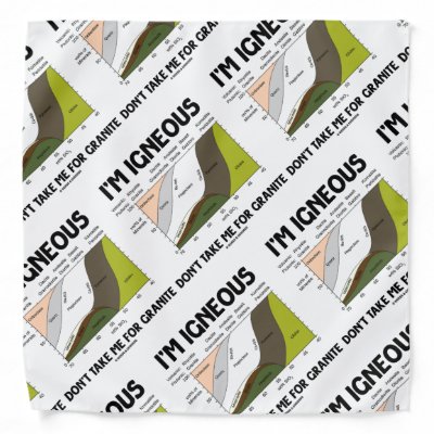 Geology humor is alive and well on this bandana featuring various igneous rock according to silica content along with the saying with an earth scientific twist: "I'm Igneous Don't Take Me For Granite" -- a pun on the saying "I'm Ignorant Don't Take Me For Granted". myEarthScience