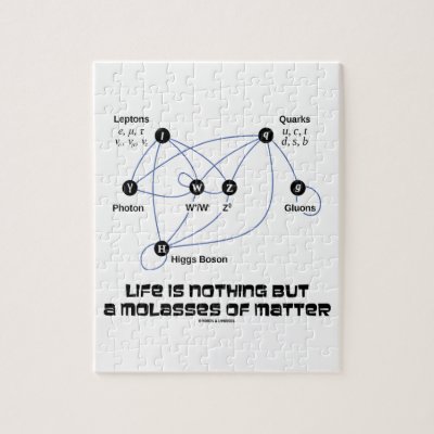 Quantum physics / particle physics attitude is alive and well on this jigsaw puzzle featuring the Standard Model of particle physics -- i.e. the Higgs field. Includes such particles as quarks leptons photons and Higgs boson. Make others do a double-take on the subject of life and matter with a dose of educational scientific fun with this physics truism saying puzzle featuring the line "Life Is Nothing But A Molasses Of Matter". myPhysics