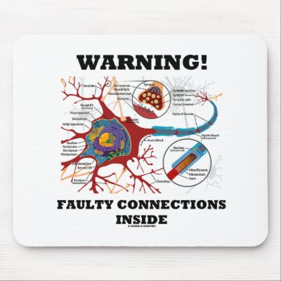 Showcase your wry neurological sense of humor with this educational scientific geek humor mousepad featuring all key parts of a neuron / synapse along with the following saying for anyone who has had a brain freeze: "Warning! Faulty Connections Inside". Neuropsychology humor at its finest on this design. myWarning