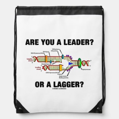 DNA replication humor and genetics attitude comes alive on this drawstring bag featuring DNA replication along with the following query: "Are You A Leader? Or A Lagger?" No matter what you do for a living question yourselves and others with this ponderous educational scientific quote featuring DNA replication and all of its parts -- including the leading strand and the lagging strand. Make others do a double-take at where they are going in life with a dose of genetic attitude with this drawstring backpack! myBiochemistry