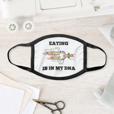 Showcase your wry scientific side toward eating with a dose of molecular biology humor with this cotton/polyester face mask featuring DNA replication along with the saying that will make others do a double-take on why they eat: "Eating Is In My DNA". Memorable biology geek humor face mask for anyone with an appetite -- no matter how much you eat! myMolecularBiology