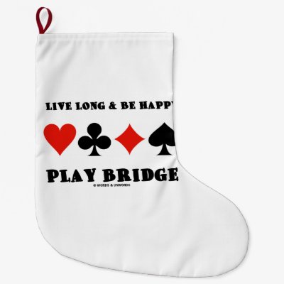If you desire to live longer and be happy and are a bridge player you'll enjoy this large xMas stocking featuring the four card suits along with the following words of wisdom that many bridge players can relate to: "Live Long & Be Happy Play Bridge". Sound bridge advice for any avid bridge / duplicate bridge player - no matter what age or what time of year! myBridgePlayer