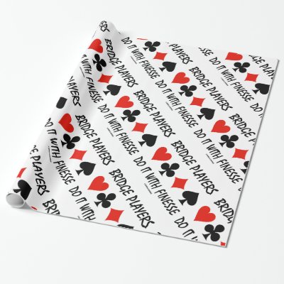 Wry bridge / duplicate bridge attitude is alive and well on this wrapping paper featuring the four card suits along with the saying "Bridge Players Do It With Finesse". Do a double-take on what bridge players do with a dose of tongue-in-cheek bridge humor with this wrapping paper! myBridgePlayer