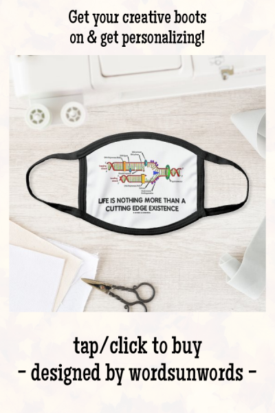 Wry molecular biology humor is alive and well and found on this cotton/polyester face mask featuring DNA replication along with the following existential scientific saying: "Life Is Nothing More Than A Cutting Edge Existence". No need to be a biologist or geneticist to enjoy wearing this face mask. myMolecularBiology