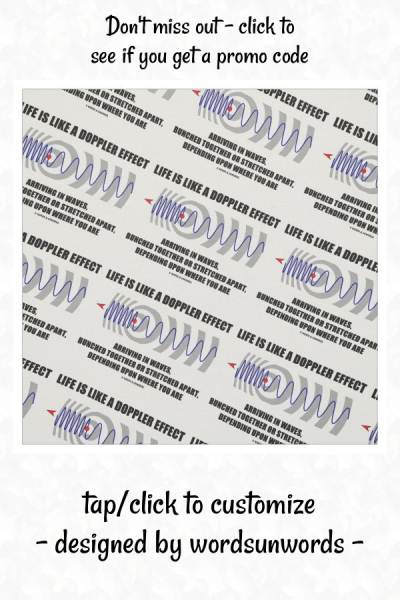 No need to be a physicist to understand the Doppler effect along with the following analogy which draws parallels between the Doppler effect and life: "Life Is Like A Doppler Effect Arriving In Waves Bunched Together Or Stretched Apart Depending Upon Where You Are". Make others do a double-take on life with a dose of scientific humor with this Doppler effect analogy the next time you create with this fabric! myPhysics