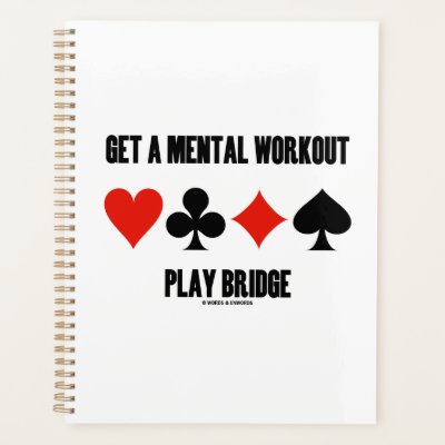 Showcase your wry probabilistic bridge player side with this binder featuring the four card suits along with the saying "Weigh Your Probabilities Play Bridge". Make others do a double-take with a dose of sound bridge advice the next time you play bridge with this binder. myBridgePlayer