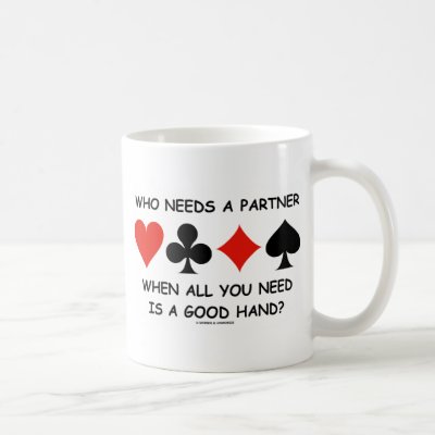 Wry bridge attitude comes alive on this mug featuring the four card suits and asks the following question: "Who Needs A Partner When All You Need Is A Good Hand?" Mug for any bridge player who wishes that one did not need a partner to play bridge and who understands that sometimes at the bridge table it just takes a good hand to win! myBridgePlayer