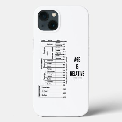 Showcase your wry geological time attitude with this iPhone 13 case featuring the eons epochs and periods throughout Earth's history along with the saying that says it all when it comes to geological age: "Age Is Relative". Memorable iPhone 13 case for any geologist earth scientist or anyone who believes that age truly is a relative phenomenon! myEarthScience