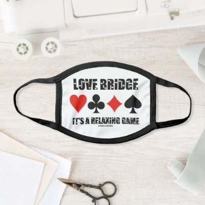 Showcase your love of the game of bridge / duplicate bridge with this cotton/polyester face mask featuring the four card suits along with the saying "Love Bridge It's A Relaxing Game". Make others do a double-take with a dose of tongue-in-cheek bridge attitude with this cotton/polyester face mask! For any bridge player who plays bridge to relax! myBridgePlayer