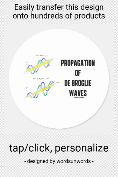 Showcase your quantum mechanics side with any of these gifts featuring the wave-particle duality of matter -- i.e. more specifically how the wavelength is inversely proportional to the momentum of a particle. Quantum physicists will enjoy any of these "Propagation Of de Broglie Waves" gifts with the real part of the complex amplitude in blue the imaginary part in green and the probability of finding the particle at a given point x spread out like a waveform. myPhysics