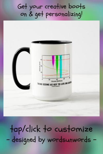 Atmospheric scientists and earth scientists will enjoy this educational attitude mug featuring the location of the ozone layer in Earth's atmosphere along with the amount of ultraviolet radiation from the sun which ozone blocks. Showcase your understanding of the importance of ozone to life on Earth with this "Think Ozone As Key To Life On Earth" graph mug! myEarthScience