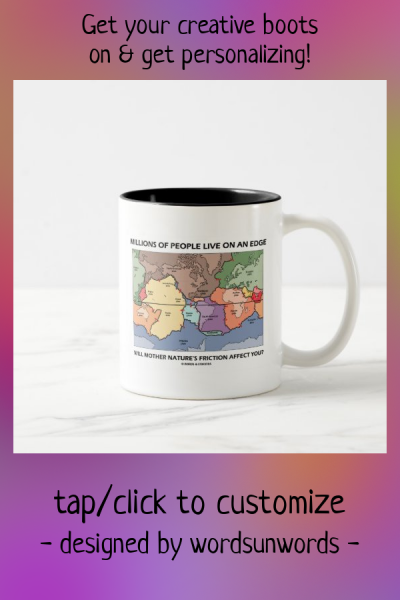 No need to be an earth scientist to understand plate tectonics the scientific theory which describes the large scale motions of Earth's lithosphere. Showcase your knowledge of the plates of the world with this mug featuring a map of the Earth's tectonic plates along with the truism saying and query: "Millions Of People Live On An Edge Will Mother Nature's Friction Affect You?" Memorable mug for any earthquake watcher! No need to have been in an earthquake or lived on a plate boundary to enjoy! myEarthScience