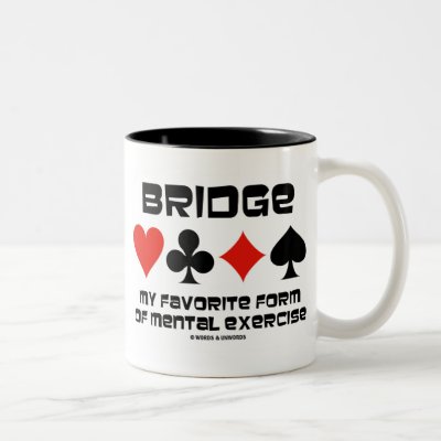 Showcase your tongue-in-cheek yet oh so serious bridge attitude with this bridge saying mug featuring the four card suits with the following words: "Bridge My Favorite Form Of Mental Exercise". Make others do a double-take with a dose of bridge / duplicate bridge humor at your next bridge game with this mug! myBridgePlayer