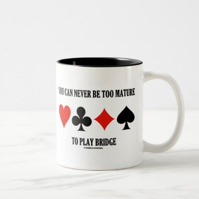 If you are a bridge player you'll enjoy this bridge saying mug featuring the four card suits along with the bridge truism saying "You Can Never Be Too Mature To Play Bridge". Double entendre bridge saying that could mean that you can never be too old to play bridge or that you can never have too much intellectual maturity about the game of bridge to play it. Make others do a double-take on what this phrase means to you and to others at your next bridge game! myBridgePlayer