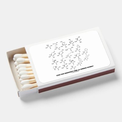 Make others do a double-take and think about amino acids with this matchbox featuring the 20 essential amino acids. Says: "Can You Identify The 20 Amino Acids?" Includes molecular structure for each of the 20 amino acids. Educational chemistry attitude for all who understand that amino acids are the building blocks of life! Identity them all if you can! myBiochemistry