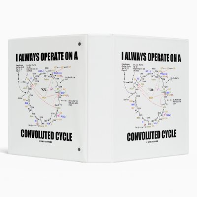If you operate on a convoluted cycle you'll enjoy this wry scientific humor binder featuring the Krebs cycle also known as the citric acid cycle or tricarboxylic acid cycle (TCAC). Comes with the saying: "I Always Operate On A Convoluted Cycle". Make others do a double-take with this biochemistry attitude binder today. Memorable scientific saying binder for doctors nurses scientists and anyone who operates on a convoluted cycle! myBiochemistry