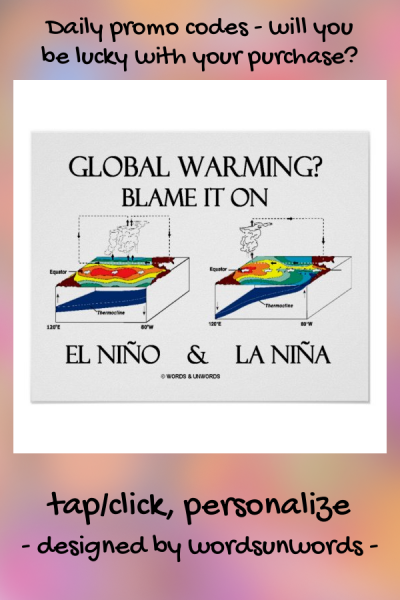 Understand the underlying factors of global warming? Showcase wry meteorological and earth scientific humor with this poster featuring El Niño and La Niña along with the following scientific saying: "Global Warming? Blame It On El Niño and La Niña". El Niño is a warming of the surface water of the eastern and central Pacific Ocean occurring every 4 to 12 years and causing unusual global weather patterns. An El Niño is said to occur when the trade winds that usually push warm surface water westward weaken allowing the warm water to pool as far eastward as the western coast of South America. La Niña is a cooling of the surface water of the eastern and central Pacific Ocean occurring somewhat less frequently than El Niño events but causing similar generally opposite disruptions to global weather patterns. La Niña conditions occur when the Pacific trade winds blow more strongly than usual pushing the sun-warmed surface water farther west and increasing the upwelling of cold water in the eastern regions. No need to be a meteorologist to enjoy! myEarthScience