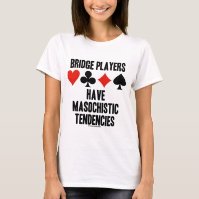 If you play bridge and find that you are going down 800 or 1100 or 1400 a lot you'll enjoy this wry duplicate bridge humor tee! Comes with the four card suits along with the bridge saying "Bridge Players Have Masochistic Tendencies". Make everyone do a double-take at the bridge table with this bridge attitude tee featuring your masochistic sense of humor today! myBridgePlayer