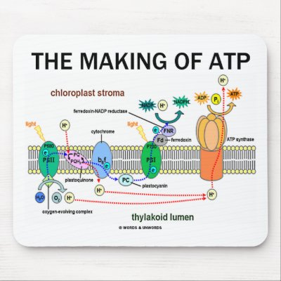 Showcase your biochemical side with this mousepad featuring "The Making Of ATP" as found in a chloroplast. Educational scientific mousepad featuring the light-dependent reactions of photosynthesis. Memorable biology mousepad for anyone who knows how ATP is produced in plants! No need to be a biologist or botanist to enjoy! myBiochemistry