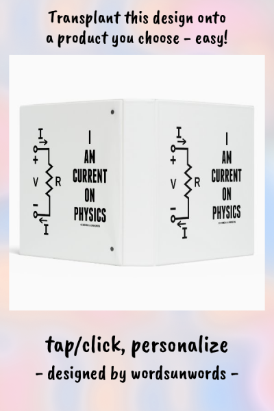 Showcase your wry attitude toward the subject of physics with a dose of Ohm's law humor with this binder featuring the parameters of Ohm's law including V (voltage) I (current) and R (resistance) along with the saying "I Am Current On Physics". No need to be a physics major or physicist to enjoy! myPhysics