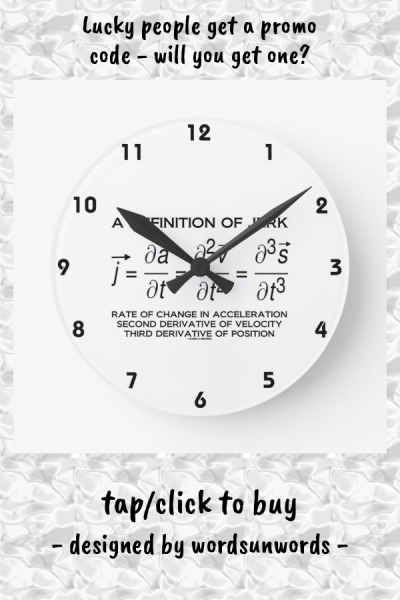 Do you know how to define jerk? Do you know about the definition of jerk in physics? In physics jerk also known as jolt surge and lurch is the rate of change of acceleration -- meaning the derivative of acceleration with respect to time the second derivative of velocity or the third derivative of position. Make others do a double-take with wry physics and engineering humor with this clock that features "A Definition Of Jerk" -- or rather the physics definition of jerk and its three variants! myPhysics