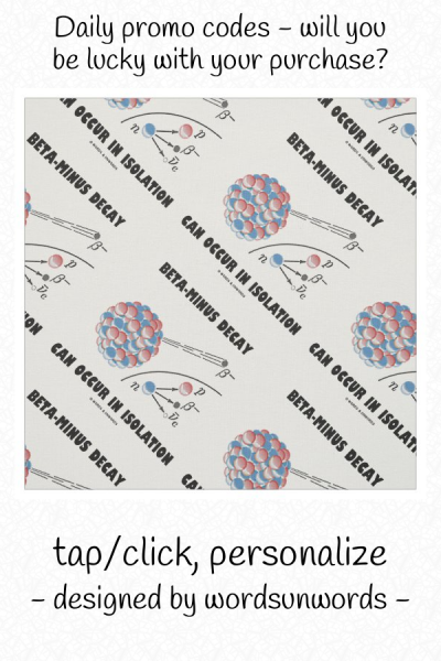 In nuclear physics beta decay is a type of radioactive decay in which a beta particle (an electron or a positron) is emitted. Under beta-minus decay an electron is emitted. Showcase your wry sense of nuclear physics the next time you create and make with this scientific educational attitude fabric featuring the truism saying "Beta-Minus Decay Can Occur In Isolation". Make others do a double-take today on beta-minus decay! myPhysics