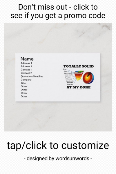 If you are a solid person -- either professionally or metaphorically -- you'll enjoy introduce yourself with a dose of wry geology geek humor with any of these business cards featuring Earth's layers. Comes with the earth science saying "Totally Solid At My Core". Make others do a double-take at what you are referring to for your next introduction! myEarthScience