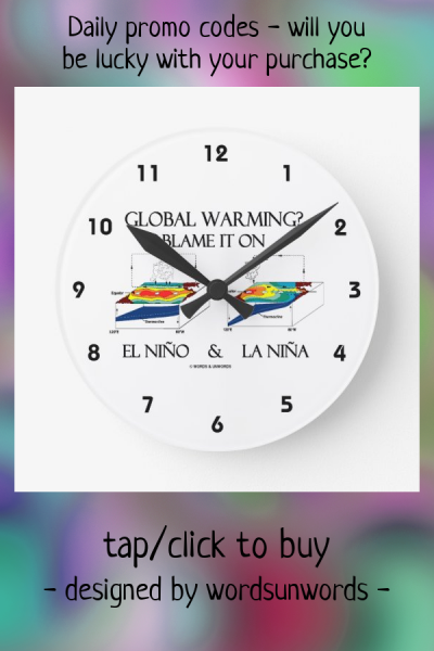 Understand the underlying factors of global warming? Showcase wry meteorological and earth scientific humor with this clock featuring El Niño and La Niña along with the following scientific saying: "Global Warming? Blame It On El Niño and La Niña". El Niño is a warming of the surface water of the eastern and central Pacific Ocean occurring every 4 to 12 years and causing unusual global weather patterns. An El Niño is said to occur when the trade winds that usually push warm surface water westward weaken allowing the warm water to pool as far eastward as the western coast of South America. La Niña is a cooling of the surface water of the eastern and central Pacific Ocean occurring somewhat less frequently than El Niño events but causing similar generally opposite disruptions to global weather patterns. La Niña conditions occur when the Pacific trade winds blow more strongly than usual pushing the sun-warmed surface water farther west and increasing the upwelling of cold water in the eastern regions. No need to be a meteorologist to enjoy! myEarthScience