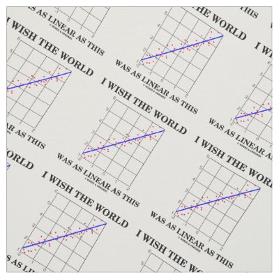 Showcase your wry statistical linear regression side when you create with this fabric that says "I Wish The World Was As Linear As This". Fabric for all those who know about linear regression who have drawn a straight line through data points and who know about wayward politics of people and institutions such that aggregate data never resemble a straight line in the first place. No need to be a statistician economist sociologist or political scientist to enjoy educational tongue-in-cheek stats humor fun with this fabric! myStatistician