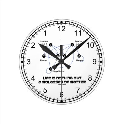 Showcase your wry quantum physics / particle physics attitude with a dose of sub-atomic Higgs field humor with this clock featuring the Standard Model of particle physics along with the following truism saying "Life Is Nothing But A Molasses Of Matter". Note clock hands move forward but the clock background is backwards. myPhysics