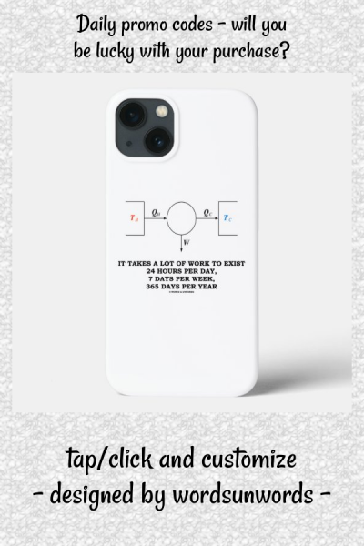 No need to be a physics major or physicist to enjoy this iPhone 13 case featuring the Carnot heat engine along with the wry truism saying "It Takes A Lot Of Work To Exist 24 Hours A Day 7 Days Per Week 365 Days Per Year". Specifically this iPhone 13 case features the second law of thermodynamics. Since any thermodynamic engine requires such a temperature difference it follows that useful work cannot be derived from an isolated system in equilibrium; there must always be an external energy source and a cold sink. Educational physics attitude iPhone 13 case for anyone who works in the thermodynamic sense of the word! myPhysics
