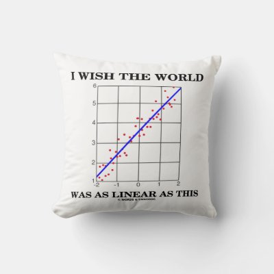 Make others do a double-take with a dose of wry statistical humor with this throw pillow featuring linear regression along with the following sentiment that any statistician or social scientist can relate to: "I Wish The World Was As Linear As This". myStatistician