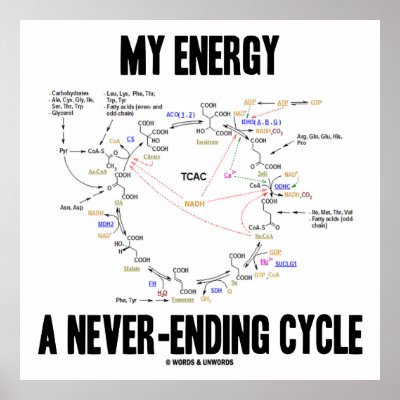 No need to be a biochemist or biologist to enjoy wry scientific humor with this poster featuring the Krebs cycle also known as the citric acid cycle or tricarboxylic acid cycle. Comes with the scientific truism saying: "My Energy A Never-Ending Cycle". Make others do a double-take on where you get your energy from with a dose of educational attitude with this poster! Showcase your indefatigable biochemical side! myBiochemistry