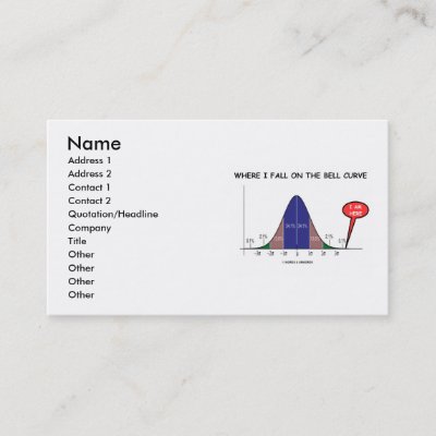 Introduce yourself with a dose of wry statistical humor with these customizable bell curve / Gaussian curve / normal distribution curve business cards with the saying "Where I Fall On The Bell Curve - I Am Here". Let others know exactly where you think you are in relation to the rest of the population with a dose of geek humor the next time you introduce yourself! myStatistician